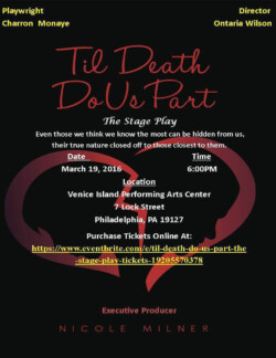 - Til Death Do Us Part, (Romance/Drama), 2015, “For twenty-year-old Caryn, a chance encounter with Bernard becomes the unexpected gift of a lifetime. As their relationship unfolds with its highs and lows, Caryn’s world is turned upside down when she discovers the shocking truth behind Bernard’s secret life. ” (Work for Hire)